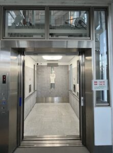 階段を降りたら、遠くにみえるエレベーターまでひたすら歩きます。