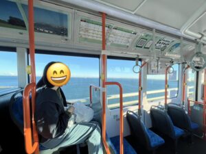 バスはしばらく工場群の間を走り、突然、視界が開けて海が現れます。